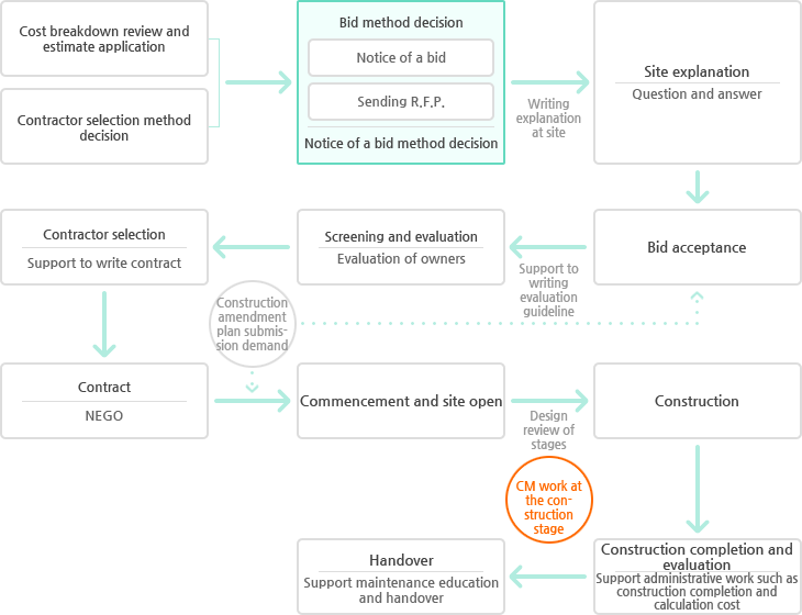 1-2. management contract of construction 1-3. management design of construction 2. Management costs of construction 3. Management process of construction 4. Management quality of construction 5. Management safety of construction 6. Management business information of construction 6-2. Follow-up service after construction 7. Articles that are determined in the construction management service contract in the year.
